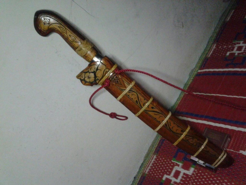 Siapkan kayu untu jadi bahan ganggang dan sarung nya , letakkan pisau di atas kayu untuk membuat pola, berikan sedikit ruang supaya pisaunya tidak susah untuk di keluarkan, siapkan dua potong kayu untuk sisi depan dan juga sisi belakangnya itu di bikin pola yang sama supaya sesuai antara depan belakangnya.